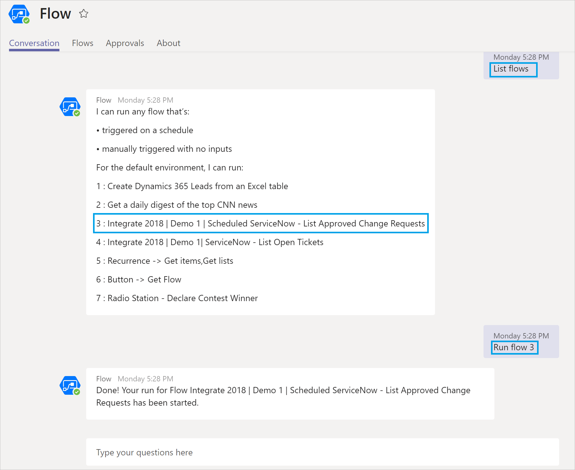 Since this is a Scheduled flow, this also means that we can invoke this flow from within Microsoft Teams itself through the Flow Bot for Microsoft Teams which we introduced this past January. This allows the owner of this flow to kick off the flow and communicate with the broader team with a few keystrokes.