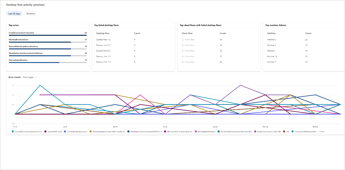 • The goal of this pivot is to provide the information of desktop flows, cloud flows and machines that are impacted by these errors and allow customers to directly reach the different details pages to quickly understand issues.