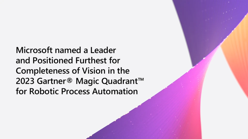 Colorful graphic design with the following wording: Microsoft has been named a Leader and Positioned Furthest for Completeness of Vision in the Gartner® Magic Quadrant™ for Robotic Process Automation