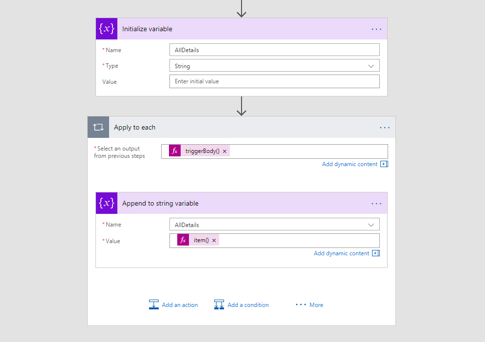 In December, we announced that you could use the Append to Array action to add items to variables that are lists. This month we have added a new action: Append to String. Like Append to Array, the Append to String action is particularly useful inside of loops like Do Until or Apply to each.