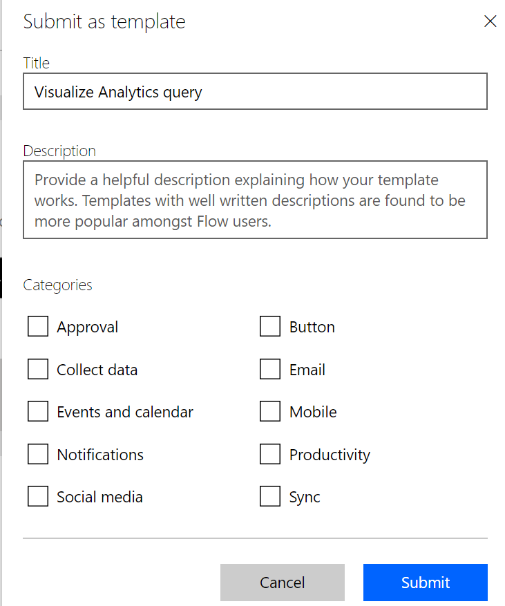 It’s now easy to publish any flows you create to the public gallery. Simply select the More… menu when you are looking at a flow and then choose the Submit to Gallery option. You can choose the set of categories for the template that will be in the gallery.