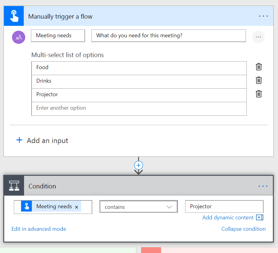 Now you can name your input, provide a description, and enter the set of options that you want the person running the flow to choose between. Once you have done this, you can add the actions for your flow. In the below example, the Meeting needs field will return back a list of options (even if the user ends up selecting only one), so you will need to use options like Contains in conditions – or – use the Join action to combine the select options into a single string of text.