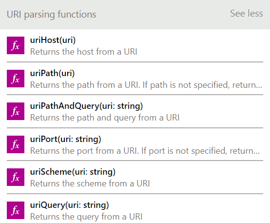 We are always adding new expressions to use in your flows. We recently added two new groups of expressions. The first helps you to parse URLs in your flows. Given a URL, you can select the hostnamepathportscheme, and query segments. As always, all of the expressions are shown in the flow designer and have full intellisense support: