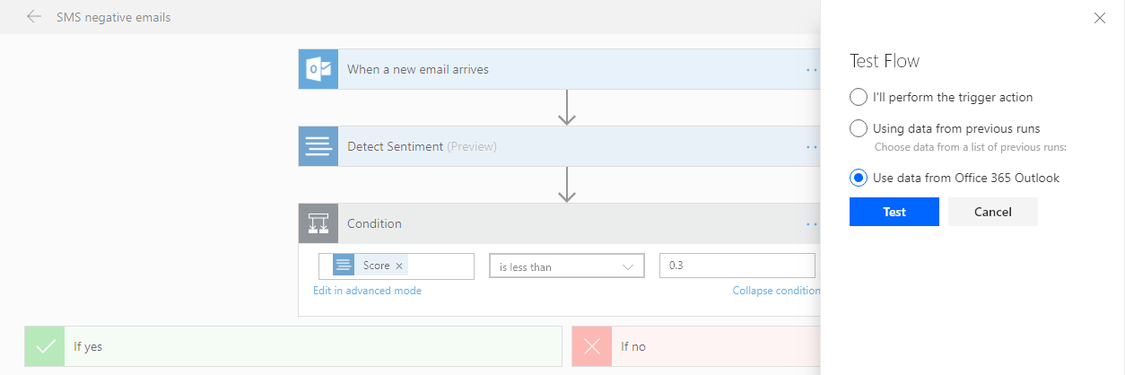 - New – Let Flow trigger the test by using example data that in pulls from the connector. For example, if you use the When a new email arrives trigger, the Flow portal will automatically get the most recent email from your inbox and use that to test your flow. Or, if you use a SQL Server trigger, it will find a row in SQL that matches the query you pass.