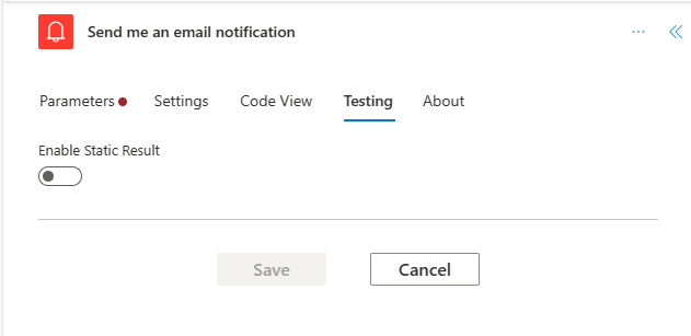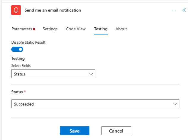 4. Disable an action or set static (mock) outputs for an action – In the new designer, if you want to disable an action rather than remove it, navigate to Testing tab of the action and enable ‘Static Outputs’ and set it to 200 Succeeded. This essentially treats the action as successful without actually running the action. Similarly, if you want to see how your flow reacts if a certain action fails with a code/succeeds with a code, you can use the same capability of ‘Static outputs’ available on the action to mock the action execution to your needs.
