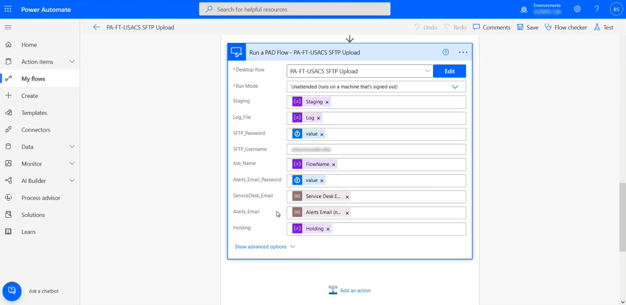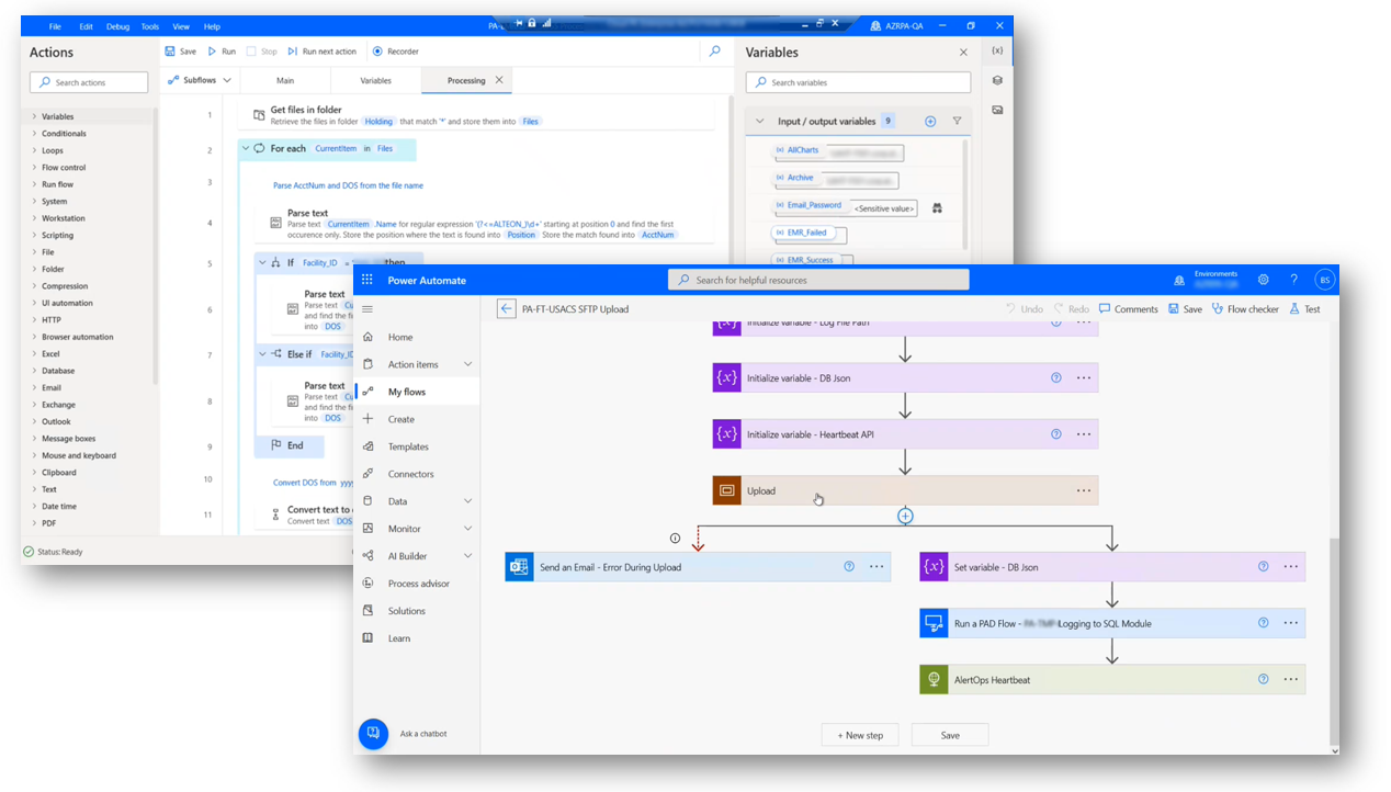 USACS’s RPA team set up Power Automate flows for each automation scenario are scalable and maintainable. The cloud flows are separated by facilities/hospitals, where a particular cloud flow handles certain file types that come from those facilities specifically. The flows are set up to be modularized, like a universal processing module, by passing variables back and forth between cloud flows and desktop flows. This means that USACS’s RPA team had to build the module only once and then provide it with the data it needs, such as metadata or processing.