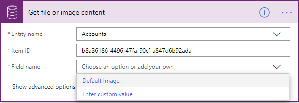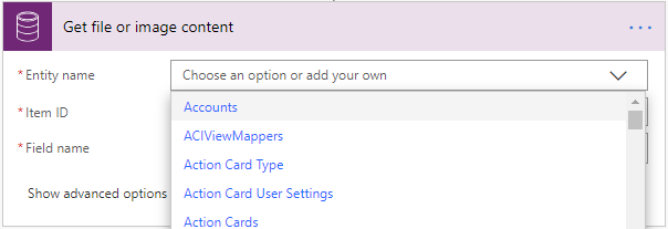 - As with any action in this connector, a dropdown list of supported entities will show up. Select the type of entity you want to download file/image content for or enter your own custom value for the entity set name.