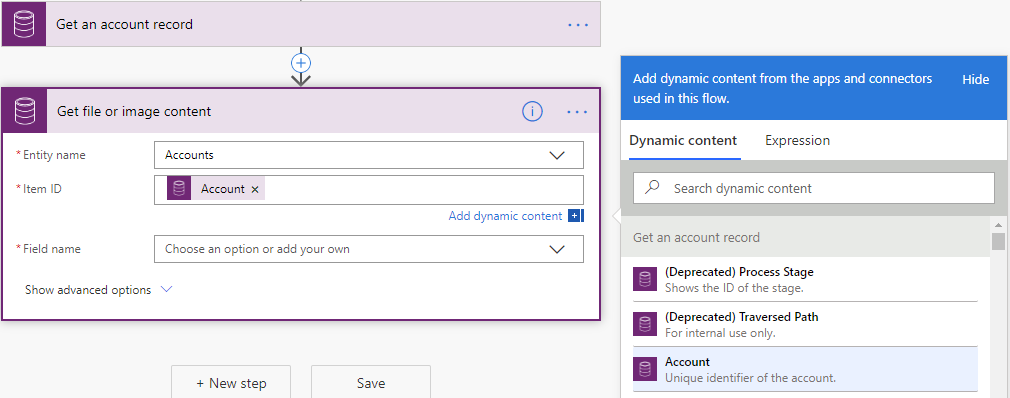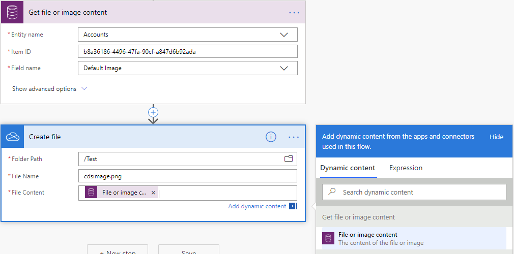 The Get file or image content action is for downloading content from corresponding file or image fields in CDS records so you can use the file content elsewhere in your flow.