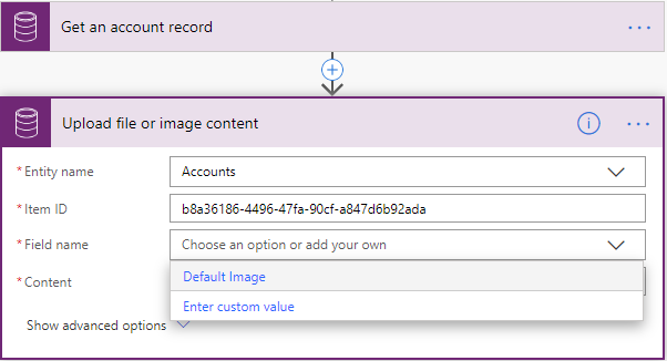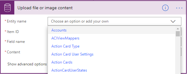 - As with any action in this connector, a dropdown list of supported entities will show up. Select the type of entity you want to upload file/image content to or enter your own custom value for the entity set name.