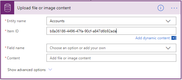 - Enter the identifier of the record you want to upload the file or image content to matching the entity type from 1 above.