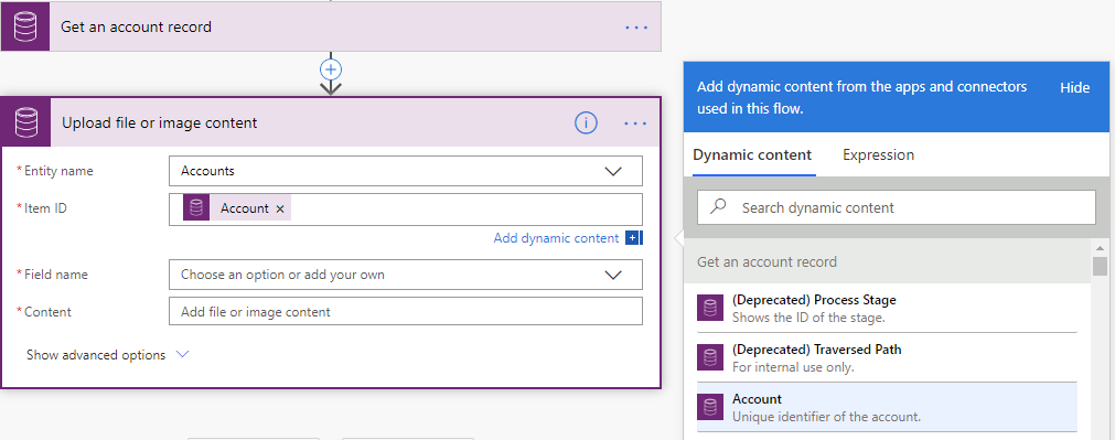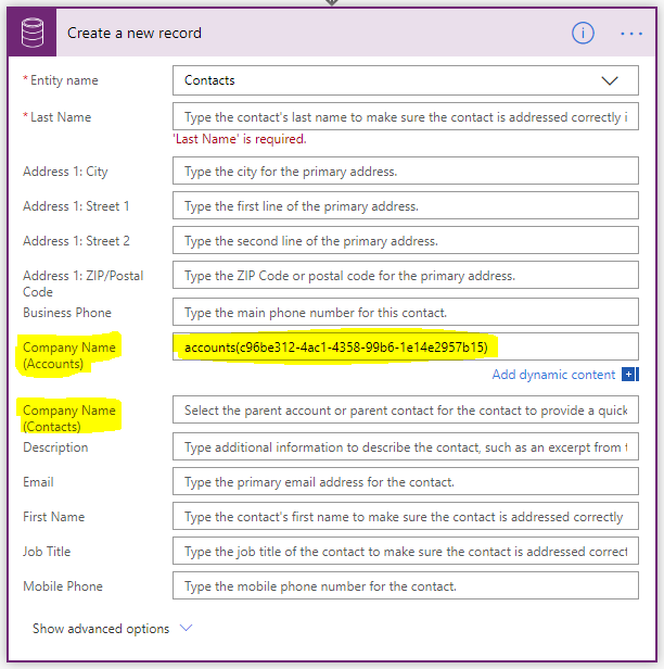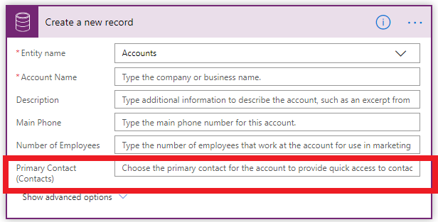 Note, if you try to just pass the guid from another step you’ll get an error like: Resource not found for the segment <segmentname>. The Common Data Service (current environment) connector expects the full OData ID of the target record, including the type of the record.