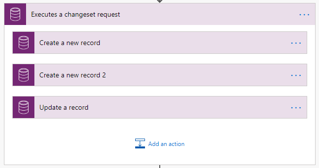 You cannot have additional built-in actions inside of a change set scope because all actions are evaluated together inside of CDS. You will see that there are no arrows between each of the actions, indicating that there are no dependencies between these actions (they’ll all be executed at once).