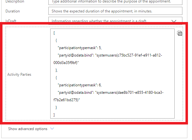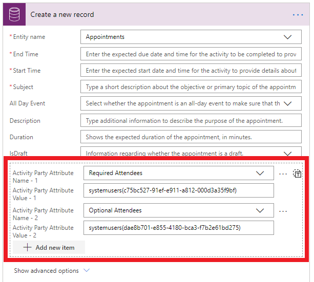 Activity parties are a special type of relationship in the Common Data Service, and are now supported as well. For example, when you create an Appointment the Required Attendees and Optional Attendees are related to the System Users entity.