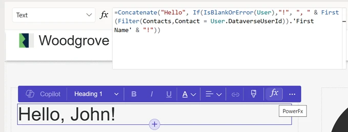 Power Fx supports reading data from Dataverse tables securely by honoring Table Permissions and also has site user context available that allows makers to provide a data enriched personalized experience on the site. For example –