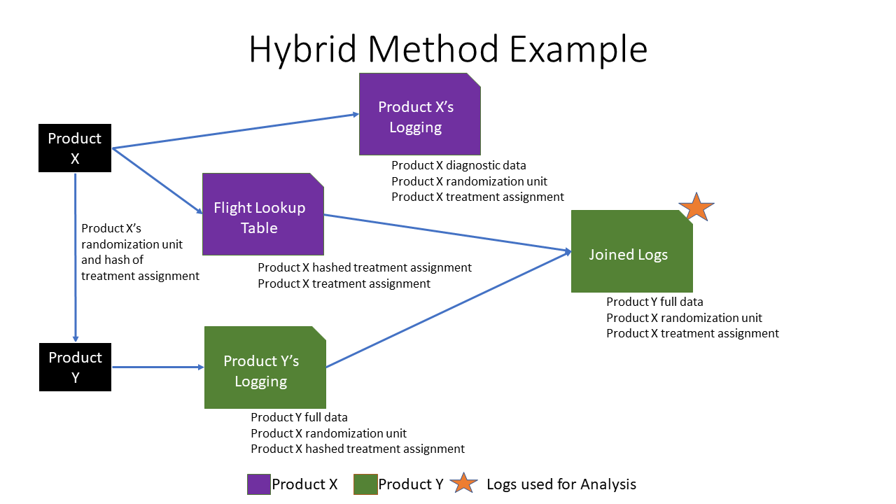 We mentioned meeting the requirements through the Online Method or the Offline Method, but it is possible to perform cross-product A/B testing using both methods. For example, it might be the case that you send the randomization unit and a one way hash of the treatment assignment to the target product (this is done online) and then you do a join from that treatment assignment hash to a table with the true treatment assignment (offline). This could be done since the treatment assignment might be too large to send online. A diagram below highlights this example. Hybrid approaches are often used within Microsoft for cross-product A/B testing.