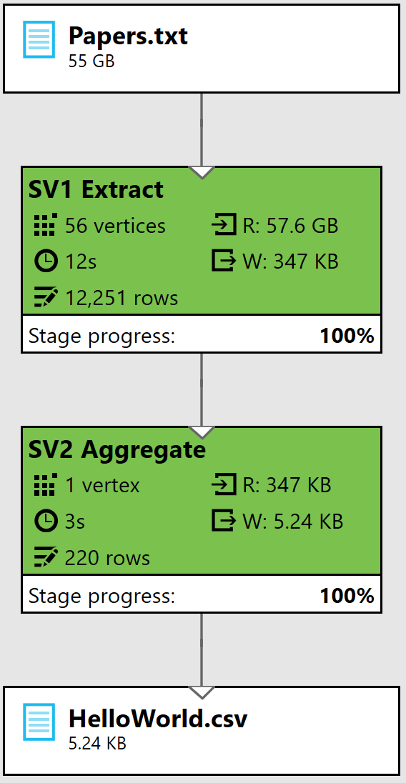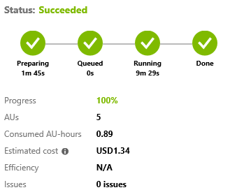 with @uriPrefix being «wasb://» + @dataVersion + «@» + @blobAccount + «/», where @dataVersion is the name of the MAG snapshot you’d like to use (for example, the November 29, 2018 snapshot of MAG, also used in the Open Academic Graph, is «mag-2018-11-29»), and @blobAccount is the Azure Blob Storage account to which you have asked us to send the MAG data. Using the default five degrees of parallelism (or in Azure’s parlance, using 5 AUs), the script takes 4 minutes and 17 seconds to finish, for a cost of U.S. $.38: