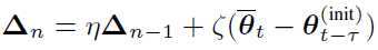 where η refers to block momentum and ζ refers to block learning rate. We set ζ=1 in this paper, which is common practice for BMUF. As discussed in [2], block momentum can compensate per mini-batch’s inadequate contribution to the final model-update caused by averaged operation to improve model performance. We defined a new variable ρ_n to represent the number of equivalent mini-batches required to get Δ_n. Since