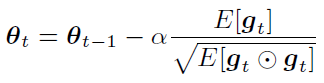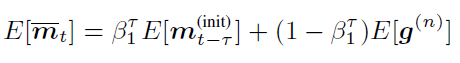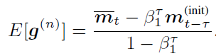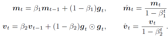 where ⨀ represents element-wise multiplication and g_t is the stochastic gradient of the t-th mini-batch. Based on the assumption that $ E[g_t]and E[g_t⊙g_t]are stationary, Adam uses an exponential moving average to estimate these two moments as follows:
