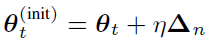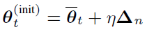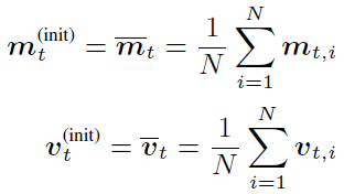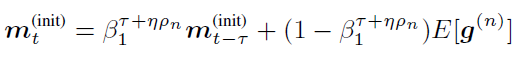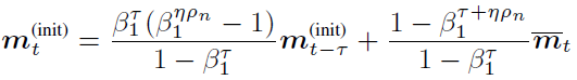 Obviously, due to the existence of ηΔ_n, the averaged 1st and 2nd moments will become stale for the initial model parameter of the next IBPO operation. Since the number of equivalent minibatches of ηΔ_n is ηρ_n, we believe the m_t^((init)),v_t^((init)) that is compatible with θ_t^((init)) can be obtained by processing ηρ_n minibatches starting from m ̅_t,v ̅_t.