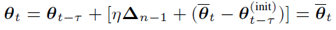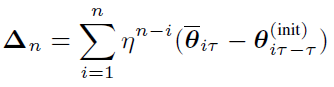 If η=1-1/N according to [2], lim┬(n→∞)(ρ_n)=Nτ, which is equal to the number of mini-batches in a data block. This deduction shows that lim┬(n→∞)(Δ_n)can simulate model-update resulting from processing Nτmini-batch data blocks in serial. This conclusion requires an assumption that θ ̅_t-θ_(t-τ)^((init)) is stationary.