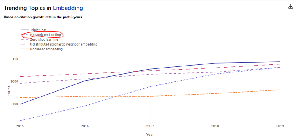 Another example that spans both the emerging field of study detection and hierarchy updates is network embedding (opens in new tab), a research topic popularized in recent years among machine learning and deep learning communities. In our hierarchy, it is an L4 concept, with embedding (opens in new tab) as a parent field of study. As you can see in the screenshot below, its popularity as an emerging field of study is obvious by the fast-growing counts of publications and citations since 2016.