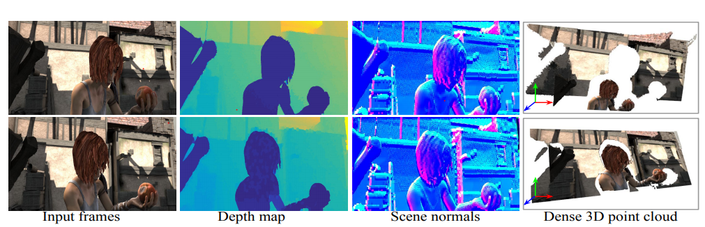 Image 4 Reconstruct the point clouds of complex dynamic scenes from two different frames of video.