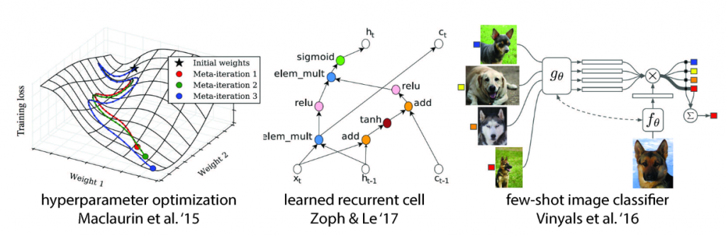 Image 6 Recent progress in meta learning. From left to right, they are meta parametric optimization, neural structure search, and small sample image classification respectively.