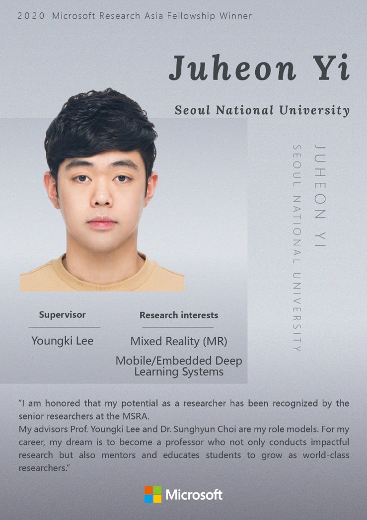 Juheon Yi, with the research interests in Mixed Reality (MR) and Mobile/Embedded Deep Learning Systems, has made efficient multi-DNN on mobile GPU for Augmented Reality (AR) scenarios. He attacks the  important area of mobile deep learning platform for AR with ambitious cross-disciplinary research work across deep learning and mobile computing. He has published two first-author papers on MobiComm’20, which he believes is the only case in Asia during the past 10 years. Juheon builds a promising research plan, to design futuristic MR apps, comprehensively analyze their workloads, and build novel enabling mobile systems to support them. To realize that vision, he plans to cover more diverse aspects of MR by conducting interdisciplinary research at the intersection of mobile computing, deep learning, multimedia, and HCI.