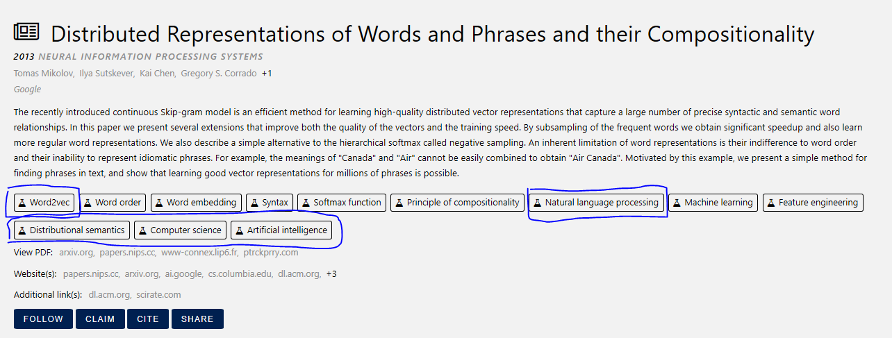 In this example, several concepts, such as Word2vec, Distributional semantics, Natural language processing, Artificial intelligence, and Computer science (all circled above), do not appear explicitly as keywords in the text body of the article. However, our algorithm can understand the semantic meaning in the text by using the latent signals derived from the language and graph topology, as mentioned above. Since the algorithm and tagging results learn with new publication data (more details are available in [Shen, et al, ACL 2018 (opens in new tab)]), each version of MAG releases concept tagging results that reflect improved tagging quality.