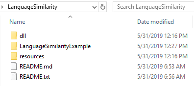 The LanguageSimilarity package is distributed as a single .zip file. It includes the algorithms, wrapped in dlls and a binary resource directory containing the pre‑trained models. After unzipping the package, users will see a folder structure as shown in the figure below. README.md and README.txt contain the general information about the package, system requirements, and API signature definitions.
