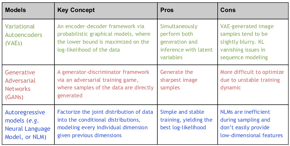 The above line of research shows that NLM has gained tremendous progress (\(P\) is increased dramatically in the equation above). Nevertheless, as an autoregressive model, NLM is just one of three types of DGMs. There are still two other types of DGMs (VAE and GAN) that can be significantly improved for large-scale uses. In this exciting era, large models are trained on large datasets with massive computing, which has given rise to a new learning paradigm: self-supervised pre-training with task-specific fine-tuning. DGMs have been studied less in this setting, and we are not sure if the tricks of DGMs can still work well in this setting for industrial practice. It raises a series of research questions, which we’ll explore in relation to each project below: