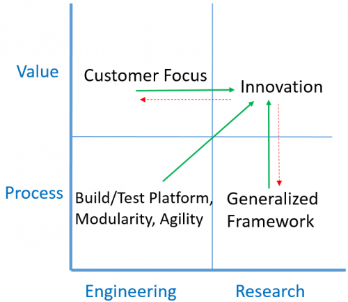 Thus, Gulwani began construction of a new kind of team. His vision had program managers focusing on customer needs (top left quadrant) and channeling the team’s innovation capacity towards those needs. Researchers would invest in creating a generalized framework (bottom-right quadrant) that would facilitate construction of specific technologies (top-right quadrant). Engineers would set up the correct engineering processes (bottom-left quadrant) so that researchers could develop product quality code. User Experience researchers would create user interface designs for specific technologies. Those designs would then be implemented by the engineers.