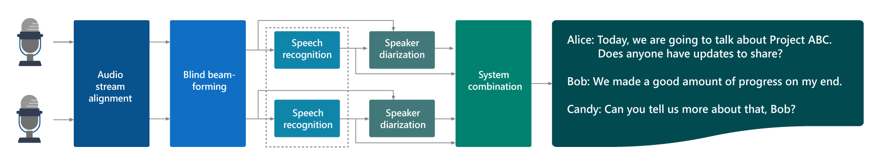 The diagram shown above depicts the resulting processing pipeline. It starts with aligning signals from different microphones, followed by blind beamforming. The term “blind” refers to the fact that beamforming is achieved without any knowledge about the microphones and their locations. This is achieved by using neural networks optimized to recover input features for acoustic models, as we reported previously. This beamformer generates multiple signals so that the downstream modules (speech recognition and speaker diarization) can still leverage the acoustic diversity offered by the random microphone placement. After speech recognition and speaker diarization, the speaker-annotated transcripts from multiple streams are consolidated by combining confusion networks that encode both word and speaker hypotheses and they are sent back to the meeting attendees. After the meeting, the attendees can choose to keep the transcripts available only to themselves or share them with specified people.