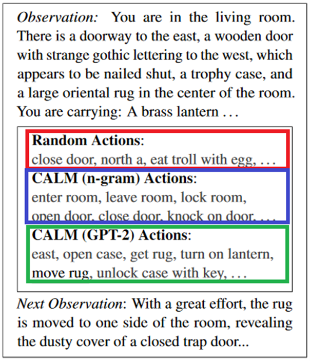 CALM (short for Contextual-Action Language Model) avoids the use of the valid-action handicap altogether by using a language model to generate a compact set of candidate actions. CALM starts from a pretrained GPT-2 model (opens in new tab)and is fine-tuned on a corpus featuring years of human-gameplay transcripts spanning 590 different text-based games. During this training process, CALM is instilled with priors that humans use when playing a large variety of text-based games.