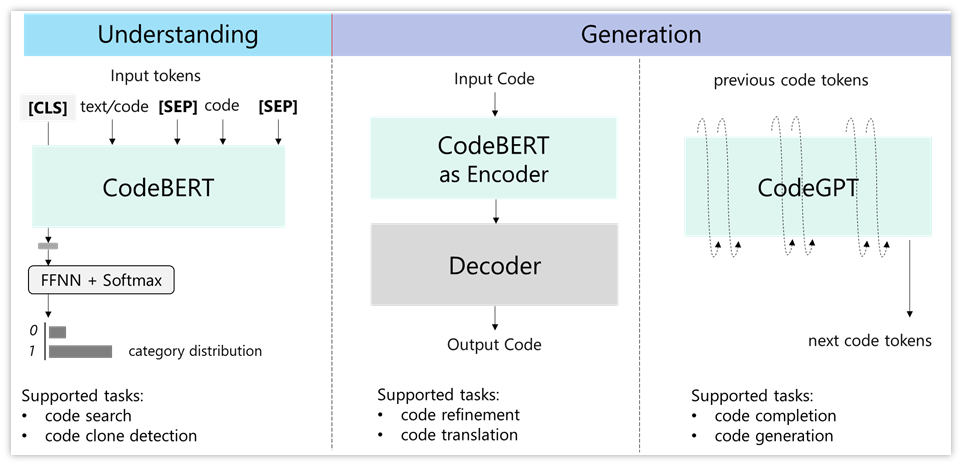 To make it easy for participants, we provide three baseline models to support these tasks, including a BERT-style pretrained model (in this case, CodeBERT (opens in new tab)), which is good at understanding problems. We also include a GPT-style pretrained model, which we call CodeGPT, to support completion and generation problems. Finally, we include an Encoder-Decoder framework that supports sequence-to-sequence generation problems.