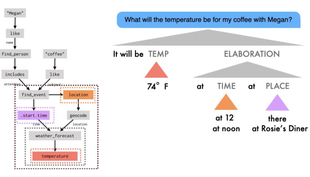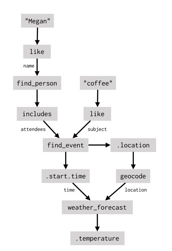 But what about more complicated requests, like What’s the temperature going to be like when I get coffee with Megan? Answering this question requires a dialogue agent to do a series of different things: figure out who Megan is, look up the event with Megan in a calendar application, figure out its start time, and use the time to query a weather service. Rather than requiring system builders to create a specialized weather_during_event_with_person intent, we translate the natural-language request into a program that ties all of these calls together. We represent this program as a dataflow graph that explicitly defines data dependencies (edges) between the steps (nodes) in the dialogue agent’s plan: