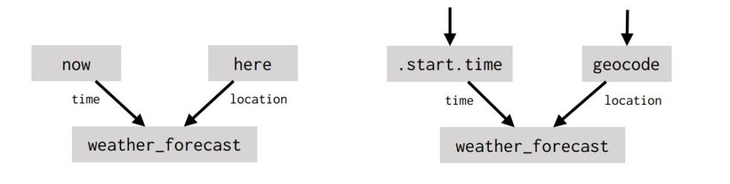 Such references can also happen implicitly. Imagine asking your device What’s the weather going to be like? Normally you mean the weather in the near future. But if you asked the same question after a future event has been mentioned, you’d likely be inquiring about the weather during that event and at the event’s location. Ultimately, these two cases require two different computations. Below, the computation on the left would be used for the near-future interpretation presented above. The computation on the right would be used for the latter event-specific interpretation: