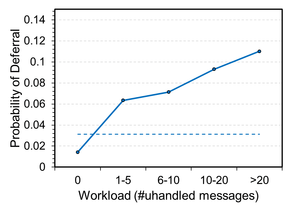 The probability of deferring an email based on the workload of the user as measured by the number of unhandled emails. The number of unhandled emails is one of many features Awadallah and his coauthors used in training their deferral prediction model.