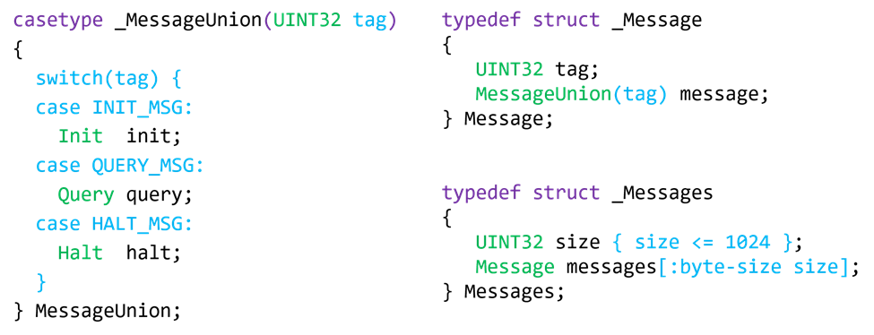The code sample above shows a simple example of an EverParse specification. The example highlights EverParse’s support for variable-length, data-dependent message formats; EverParse uses a syntax that augments C’s syntax of type definitions with various kinds of semantic constraints (highlighted in blue). The variable-length Messages structure pairs a size field, constrained to be at most 1024, with an array of messages whose size in bytes is exactly size. The Message structure itself pairs a tag with a message field, a data-dependent union, or a casetype, whose case is determined by the tag.