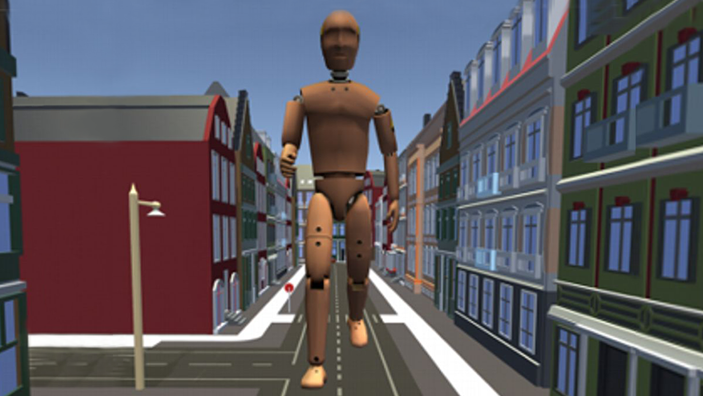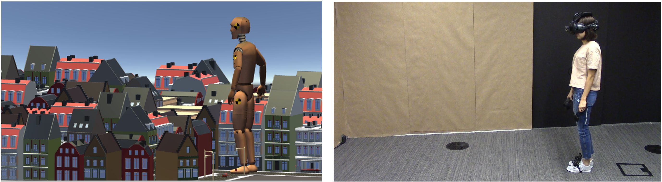 Figure 1: I’m a giant. By scaling down the city the user can walk naturally, while every step is 10x larger relative to the city. The sensation is as if the user is a giant Gulliver waking in a Lilliputian world.