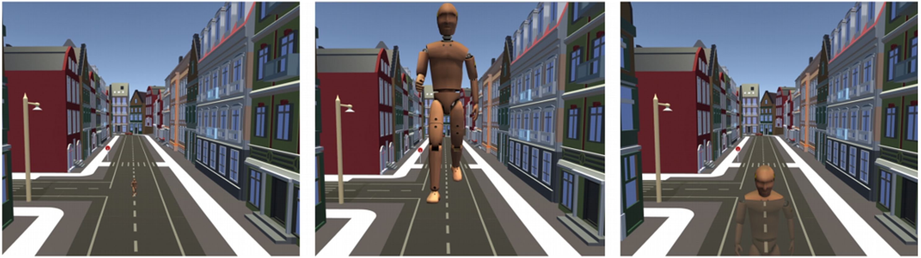 Figure 2: The virtual city as seen by a user walking in its main street at a regular scale (left). The user walking down the same street while scaled to a giant (center). When researchers maintained the user’s point of view at ground level, users achieved a natural fast motion with good control.