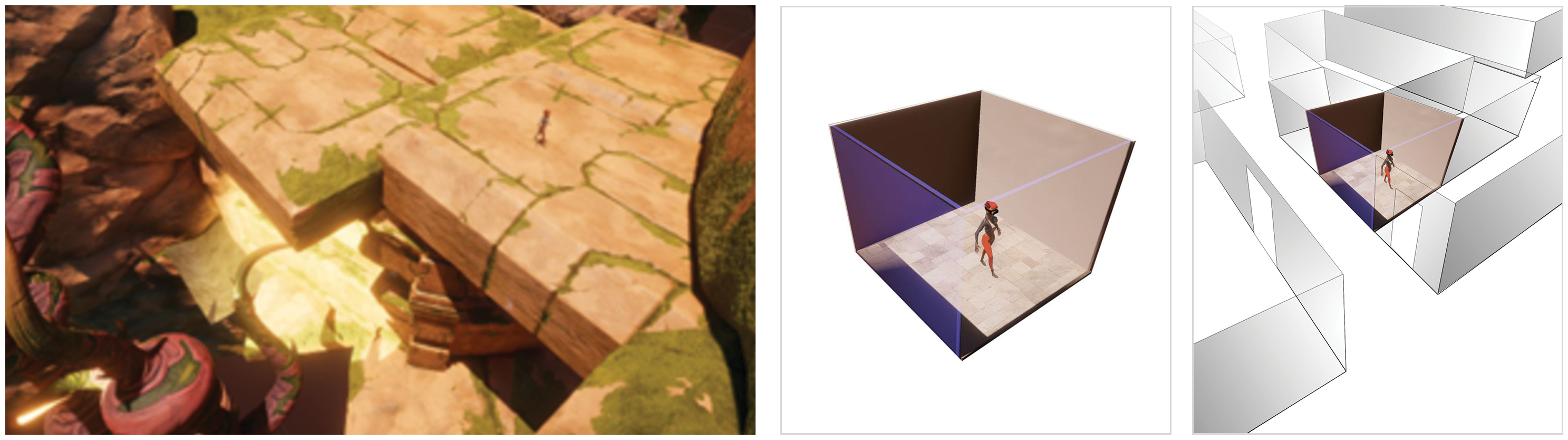 Figure 3: In current virtual reality systems, users wander around a large virtual world (left) while being physically confined to a small empty room (center). Microsoft Research has now developed VRoamer, a VR system that enables users to physically walk in a large natural building environment while keeping the user safe and maintaining story.