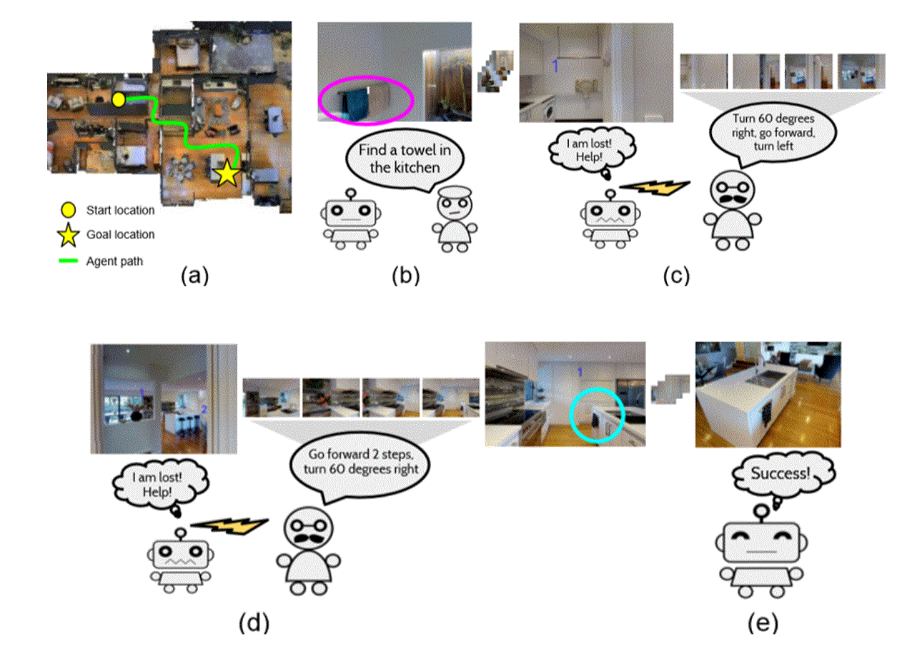 To help bring the dream within reach, we’ve created Vision-based Navigation with Language-based Assistance (VNLA). VNLA is a new grounded vision-language task for training agents not only to respond to open-ended requests—that is, those without turn-by-turn instructions—but to also strategically ask for help via language when it is needed. This capability relies on a novel framework we’ve termed “Imitation Learning with Indirect Intervention” (I3L). We’re presenting the paper on this work at the annual computer vision conference CVPR (opens in new tab). A video demonstrating the approach is available (opens in new tab), and code and data-downloading scripts for the work can be accessed via GitHub (opens in new tab).