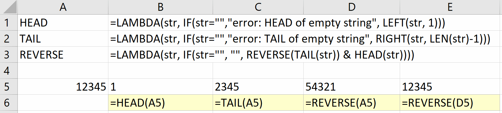 Reversing a string is beyond the built-in functions of Excel and could only previously be written outside the formula language, by using Visual Basic or JavaScript. Here is a definition of REVERSE as a recursive LAMBDA, which makes use of a couple of auxiliary functions—HEAD and TAIL—to compute the first character and everything but the first character, respectively.