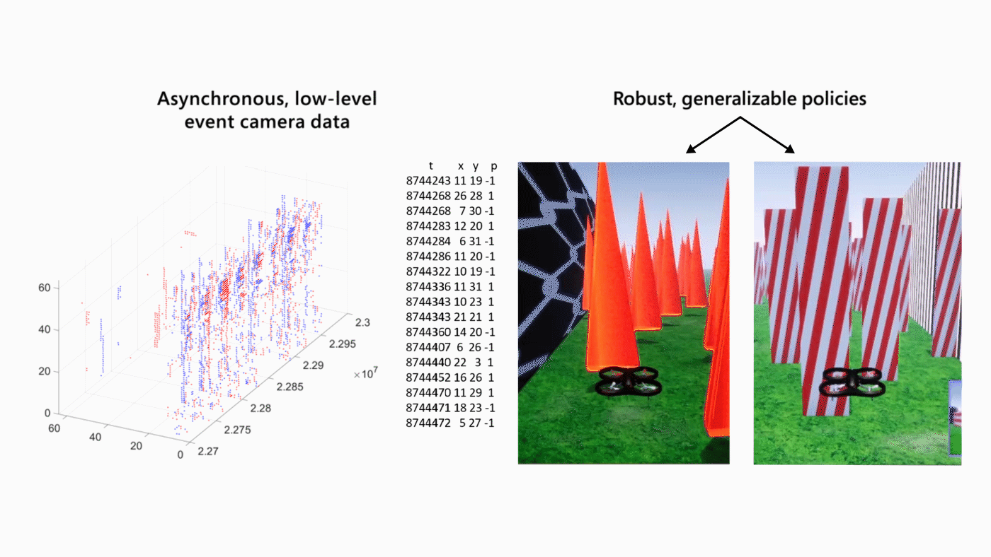 In our recent paper, “Representation Learning for Event-based Visuomotor Policies,” we take these challenges head on by using ideas in unsupervised representation learning combined with the power of recent camera technology called neuromorphic or event cameras (opens in new tab). Pairing the data streams from low-level sensors like event cameras with reinforcement learning leads to fast, instinctive, and redundant perception-action loops, which could result in autonomous systems that are able to reason quickly and safely about their surroundings. We also conduct tests of our new pipeline in Microsoft AirSim (opens in new tab) using a new feature that allows for simulating the output of an event camera. A codebase to train and evaluate models based on our work can be found at our GitHub repository (opens in new tab).
