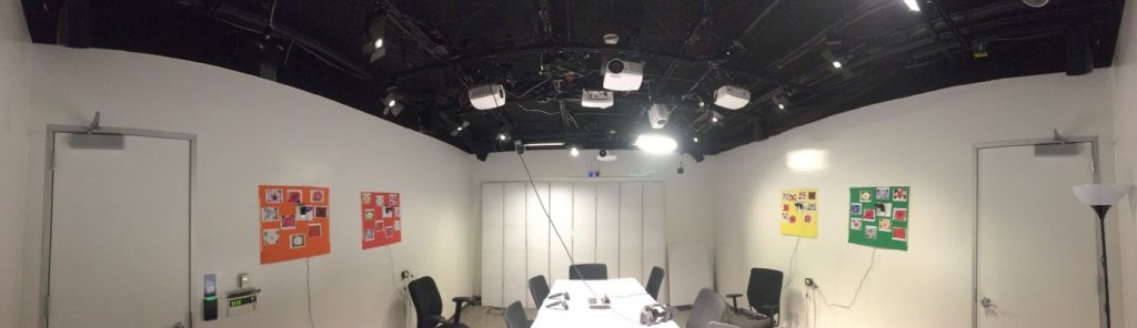 We set out to combine the benefits of VR and AR by creatively manipulating space and time in mixed reality. We created a mixed reality environment where users see a live representation of their environment. In contrast to other approaches, users do not see the image from a head-mounted camera. Instead, we equipped the room with eight ceiling-mounted Kinect cameras (see Figure 2.) The data from the cameras is combined into a single full-room 3D reconstruction. Users wear a VR display and see a reconstructed live view of the environment. We match the user’s virtual viewpoint to their physical position in the room. This means that physical objects and their virtual representations are aligned. Since the data is live, any changes in the physical environment (for example, furniture moving or people entering the room) are visible in real time to users. They can still touch and feel the real world while gaining the ability to perform nearly arbitrary visual changes.