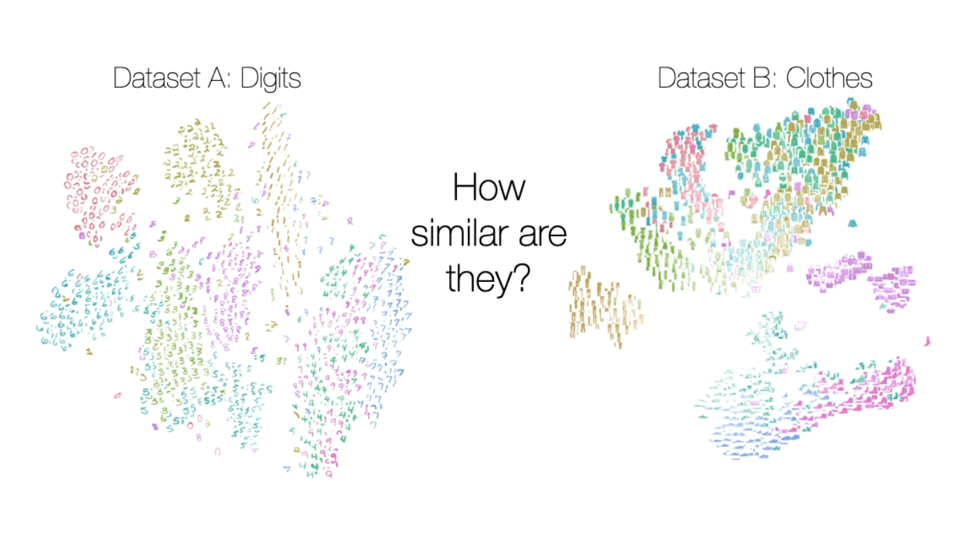 The last of these challenges—dealing with datasets having disjoint label sets—is much harder to overcome. Indeed, how can we compare the category “shoe” from FashionMNIST to the “6” category in MNIST? And what if the number of categories is different in the two datasets? For example, what if we’re comparing MNIST, which has 10 categories, to ImageNet, which has 1,000? Our solution to this conundrum, in a nutshell, relies on representing each label by the collection of points with that label and, as is the case with enforcing invariance to dataset size, formally treating the collections as probability distributions. Thus, we can compare any two categories across different datasets by comparing their associated collections—understood, again, as probability distributions—in feature space, which also then allows us to extend the comparison across the entire datasets themselves.