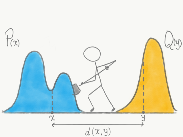 But what does dirt and shoveling have to do with statistics or machine learning? As it turns out, the intuitive framework devised by Monge provides an ideal formulation for comparing probability distributions. Let us think of probability density functions as the piles of dirt, where the “height” of the pile corresponds to the probability density at that point, and shoveling dirt between the piles as moving probability from one point to another, at a cost proportional to the distance between these two points. Optimal transport gives us a way to quantify the similarity between two probability density functions in terms of the lowest total cost incurred by completely shoveling one pile into the shape and location of the other.