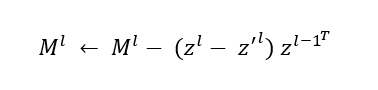 In executing the learned local update rule, we decouple the computation of each layer of the neural memory into separate forward propagation, shown in blue in Figure 2, and backward feedback prediction functions (BFPF), shown in orange. For a neural memory layer l, the BFPF makes a prediction for an expected activation z‘l based on the target value. Using the perceptron learning rule, we update the weights of the layer as follows, where zl and zl-1 are activations of the current and previous layers: