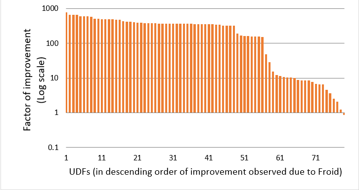 Based on an experimental evaluation on several real workloads, we demonstrate that Froid can optimize a fairly large subset of UDFs in the wild and it can result in significant benefits in both improving performance and reducing resource (CPU and IO) utilization. Figure 1 shows the factor of improvement observed thanks to Froid on one of the customer workloads. This workload had 93 UDFs and Froid was able to optimize 86 of them. UDFs are plotted along the x-axis, ordered by the observed improvement with Froid (in descending order). The y-axis shows the factor of improvement (in log scale). You can see that the UDFs run about 5x to 1000x faster due to Froid. More details and evaluations can be found in our paper.